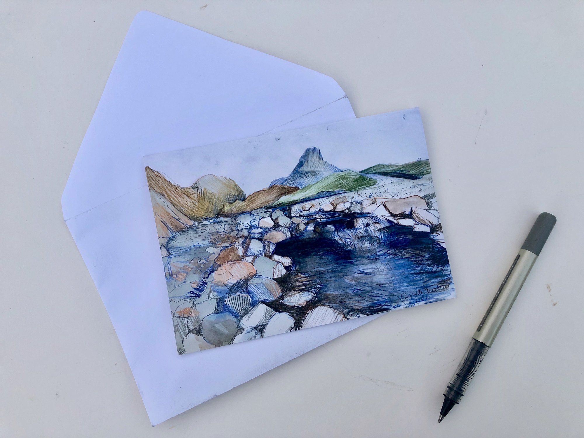 A reproduction of a colour pencil drawing looking from Inverpolly bay towards Stac Pollaidh, Wester Ross, North West Scotland.