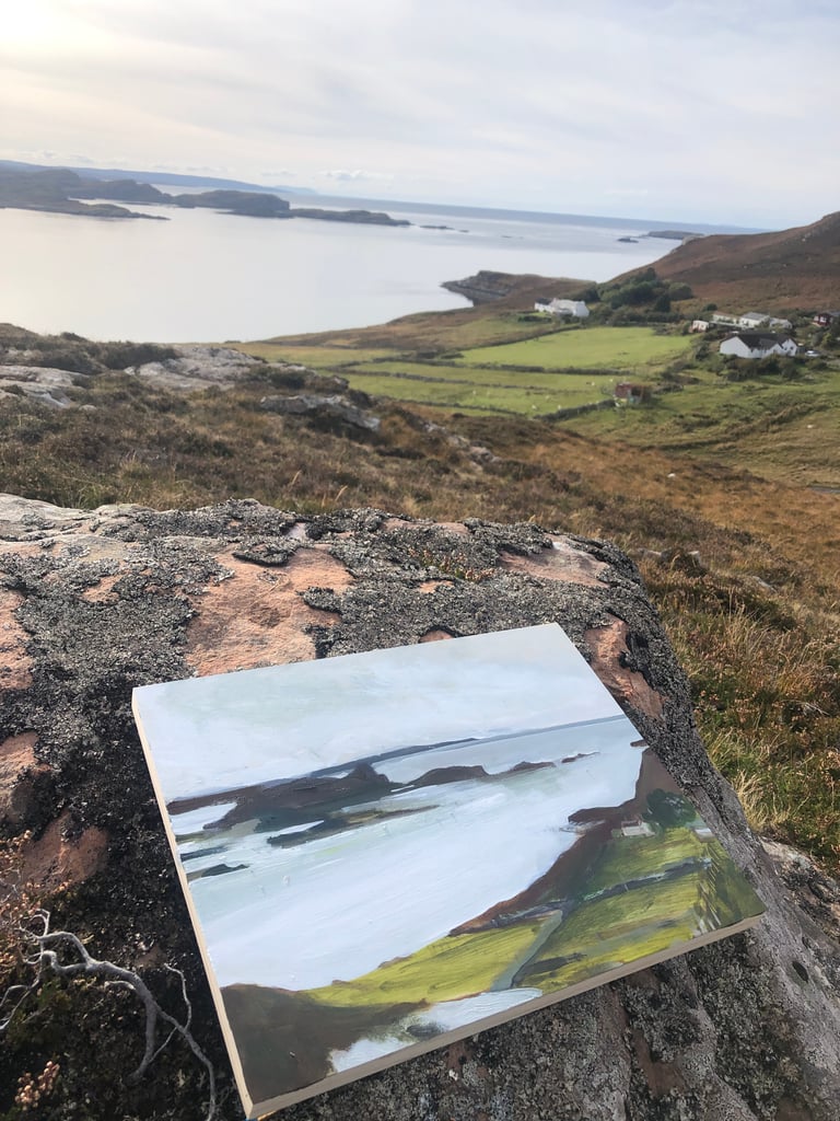 Painting looking down on Dornie, by Polbain, looking out over the islands and south to Rhu Reigh. Painted on site on a bright calm day