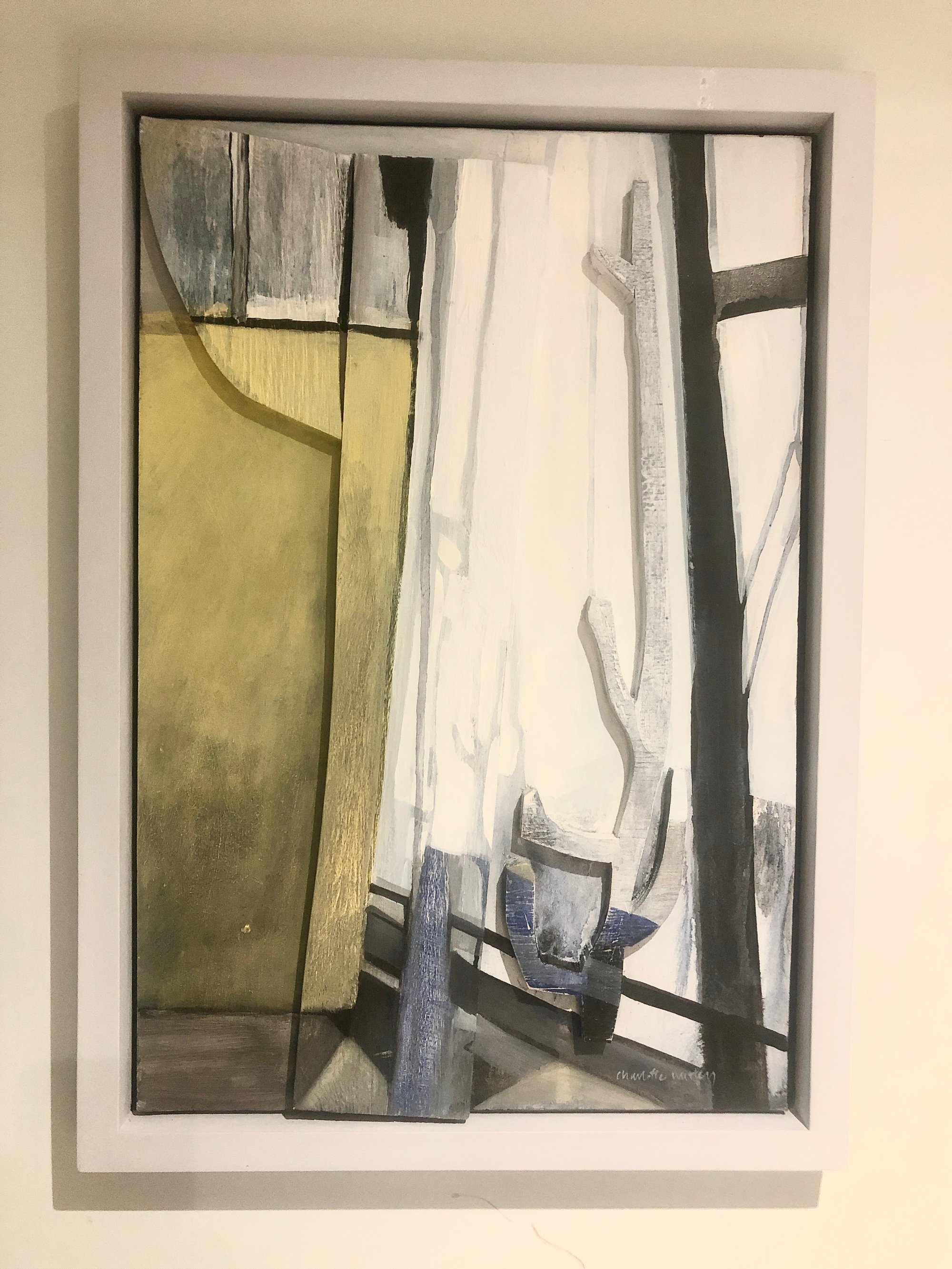 This is an abstracted painting of the Wheelhouse and rigging on board the former Fishing boat the Harvest Lilly. This painting has relief sections of wood painted and incorporated into the image.